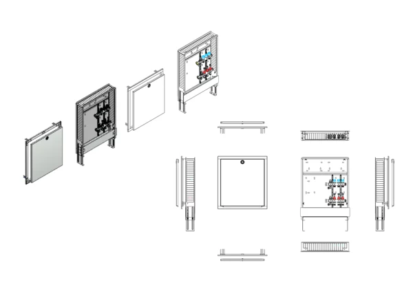 Modulare Anschlussstation für Flächenheizung und -kühlung, im Unterputzschrank montierter Edelstahlverteiler mit absperrbarem Durchflussanzeigern und Ventileinsätzen für EGO-Schnellverschluss, Platzhaltung für Anschlussgarnituren mit oder ohne Wärmezählerverrohrung, Wasserzählereinbaustrecken, Klemmleiste und EGO-Regelantrieben.