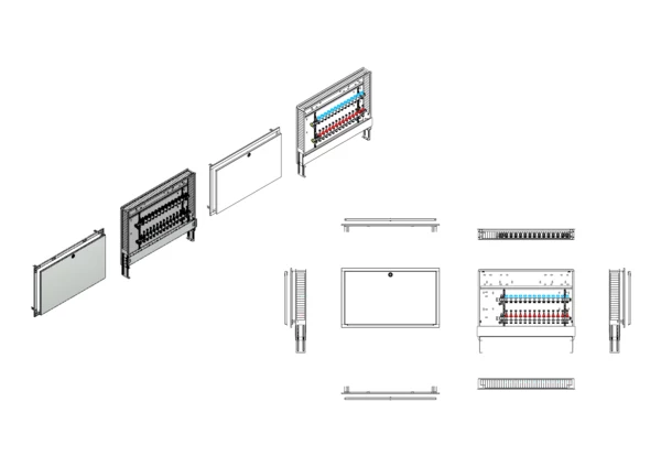 Modulare Anschlussstation für Flächenheizung und -kühlung, im Unterputzschrank montierter Edelstahlverteiler mit absperrbarem Durchflussanzeigern und Ventileinsätzen für EGO-Schnellverschluss, Platzhaltung für Anschlussgarnituren mit oder ohne Wärmezählerverrohrung, Wasserzählereinbaustrecken, Klemmleiste und EGO-Regelantrieben.