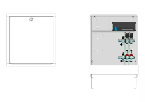 strawa Comfort Anschlussstation FBH-63-X-C69-E 2 Hkr.,BxHxT: 600 x 775 x 122 mm, ohne Anschlussgarnitur, Verteiler mit DFA 0-3 l/min + THV M30x1,5, mit vorm. Stellantrieben und Klemmleiste mit Vorverdrahtung, Comfort-UP-Schrank mit Frontblende in RAL 9016