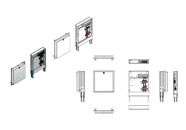 Modulare Anschlussstation für Flächenheizung, im Unterputzschrank montierter Edelstahlverteiler mit regulierbaren Durchflussanzeigern und Ventileinsätzen (M30x1,5), horizontale Anschlussgarnitur ohne Wärmezählerverrohrung, vormontierte und verdrahtete Stellantriebe auf montierter Klemmleiste, Platzhaltung für Anschlussgarnituren mit oder ohne Wärmezählerverrohrung und Wasserzählereinbaustrecken.