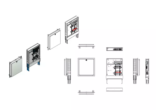 Modulare Anschlussstation für Flächenheizung, im Unterputzschrank montierter Edelstahlverteiler mit regulierbaren Durchflussanzeigern und Ventileinsätzen (M30x1,5), horizontale Anschlussgarnitur ohne Wärmezählerverrohrung, vormontierte und verdrahtete Stellantriebe auf montierter Klemmleiste, Platzhaltung für Anschlussgarnituren mit oder ohne Wärmezählerverrohrung und Wasserzählereinbaustrecken.