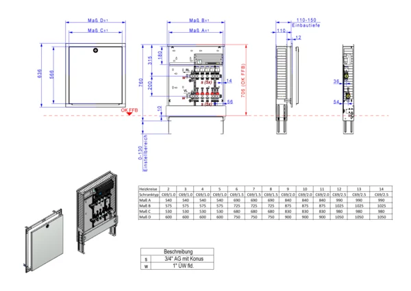 strawa Comfort Anschlussstation FBH-63-X-C69-E 4 Hkr.,BxHxT: 600 x 775 x 122 mm, ohne Anschlussgarnitur, Verteiler mit DFA 0-3 l/min + THV M30x1,5, mit vorm. Stellantrieben und Klemmleiste mit Vorverdrahtung, Comfort-UP-Schrank mit Frontblende in RAL 9016
