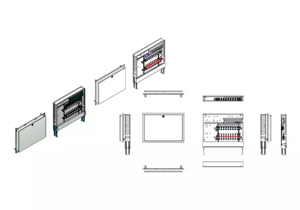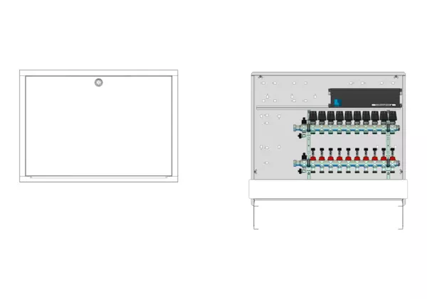Modulare Anschlussstation für Flächenheizung, im Unterputzschrank montierter Edelstahlverteiler mit regulierbaren Durchflussanzeigern und Ventileinsätzen (M30x1,5), horizontale Anschlussgarnitur ohne Wärmezählerverrohrung, vormontierte und verdrahtete Stellantriebe auf montierter Klemmleiste, Platzhaltung für Anschlussgarnituren mit oder ohne Wärmezählerverrohrung und Wasserzählereinbaustrecken.