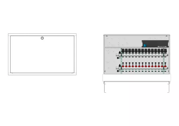 strawa Comfort Anschlussstation FBH-63-X-C69-E 14 Hkr.,BxHxT: 1050 x 775 x 122 mm, ohne Anschlussgarnitur, Verteiler mit DFA 0-3 l/min + THV M30x1,5, mit vorm. Stellantrieben und Klemmleiste mit Vorverdrahtung, Comfort-UP-Schrank mit Frontblende in RAL 9016