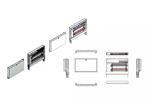 Modulare Anschlussstation für Flächenheizung, im Unterputzschrank montierter Edelstahlverteiler mit regulierbaren Durchflussanzeigern und Ventileinsätzen (M30x1,5), horizontale Anschlussgarnitur ohne Wärmezählerverrohrung, vormontierte und verdrahtete Stellantriebe auf montierter Klemmleiste, Platzhaltung für Anschlussgarnituren mit oder ohne Wärmezählerverrohrung und Wasserzählereinbaustrecken.