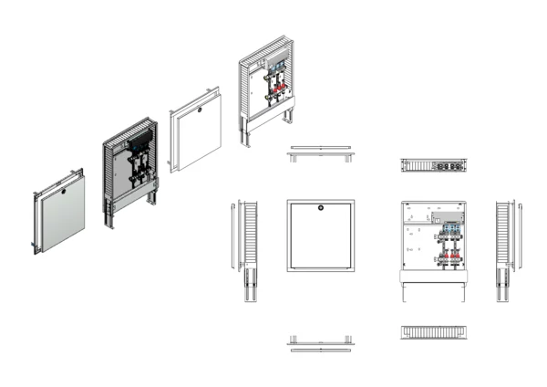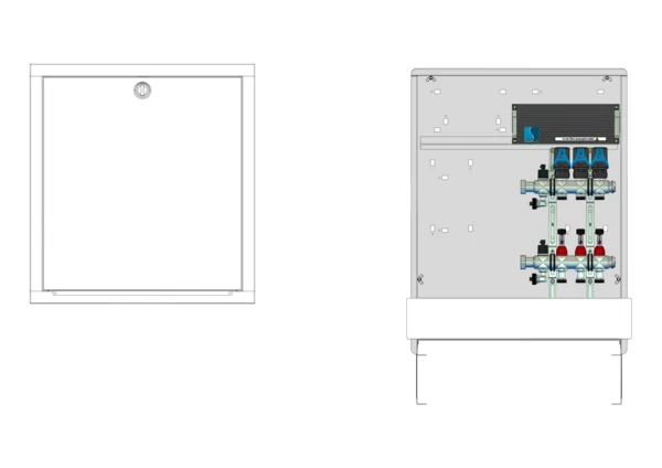 Modulare Anschlussstation für Flächenheizung, im Unterputzschrank montierter Edelstahlverteiler mit absperrbarem Durchflussanzeigern und Ventileinsätzen für EGO-Schnellverschluss, vormontierte und vorverdrahtete EGO-Regelantriebe auf vormontierter Klemmleiste, Platzhaltung für Anschlussgarnituren mit oder ohne Wärmezählerverrohrung und Wasserzählereinbaustrecken.