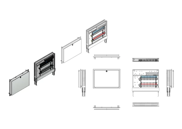 Modulare Anschlussstation für Flächenheizung, im Unterputzschrank montierter Edelstahlverteiler mit absperrbarem Durchflussanzeigern und Ventileinsätzen für EGO-Schnellverschluss, vormontierte und vorverdrahtete EGO-Regelantriebe auf vormontierter Klemmleiste, Platzhaltung für Anschlussgarnituren mit oder ohne Wärmezählerverrohrung und Wasserzählereinbaustrecken.