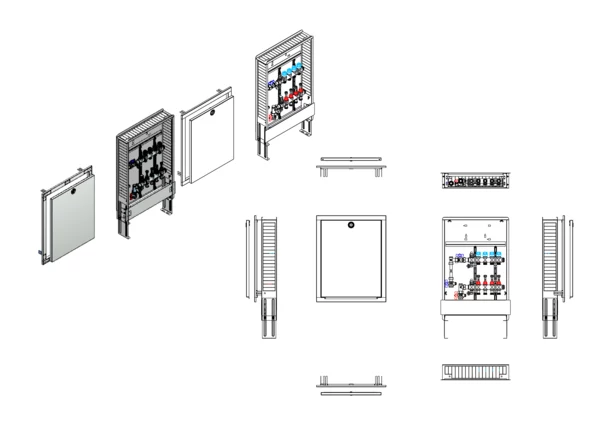 Anschlussstation für Flächenheizung und -kühlung, im Unterputz-Schrank montierter Edelstahlverteiler mit absperrbaren Durchflussanzeigern und Ventileinsätzen für EGO-Schnellverschluss, vertikale Anschlussgarnitur mit Wärmezählerverrohrung, Platzhaltung für Wasserzählereinbaustrecke, Klemmleiste und EGO-Regelantriebe.