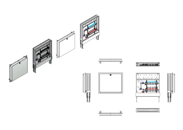 Anschlussstation für Flächenheizung und -kühlung, im Unterputz-Schrank montierter Edelstahlverteiler mit absperrbaren Durchflussanzeigern und Ventileinsätzen für EGO-Schnellverschluss, vertikale Anschlussgarnitur mit Wärmezählerverrohrung, Platzhaltung für Wasserzählereinbaustrecke, Klemmleiste und EGO-Regelantriebe.
