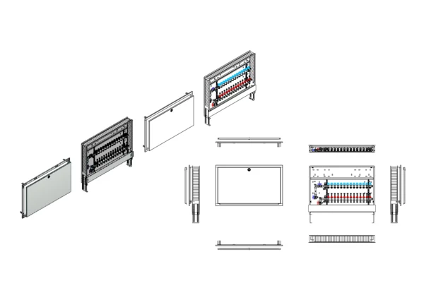 Anschlussstation für Flächenheizung und -kühlung, im Unterputzschrank montierter Edelstahlverteiler mit absperrbarem Durchflussanzeigern und Ventileinsätzen für EGO-Schnellverschluss, vertikale Anschlussgarnitur mit Wärmezählerverrohrung, Platzhaltung für Wasserzählereinbaustrecke, Klemmleiste und EGO-Regelantriebe.