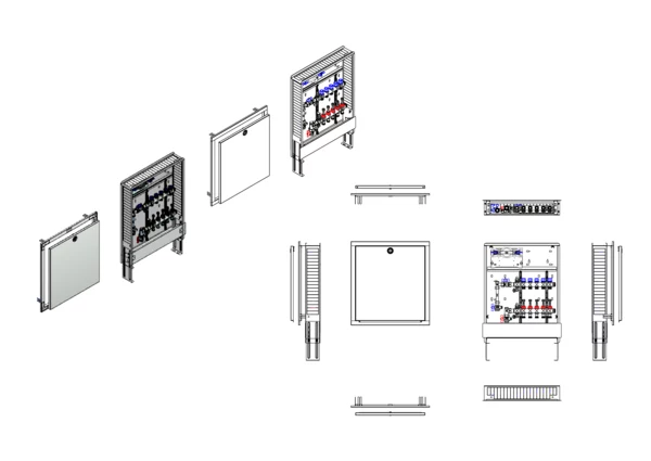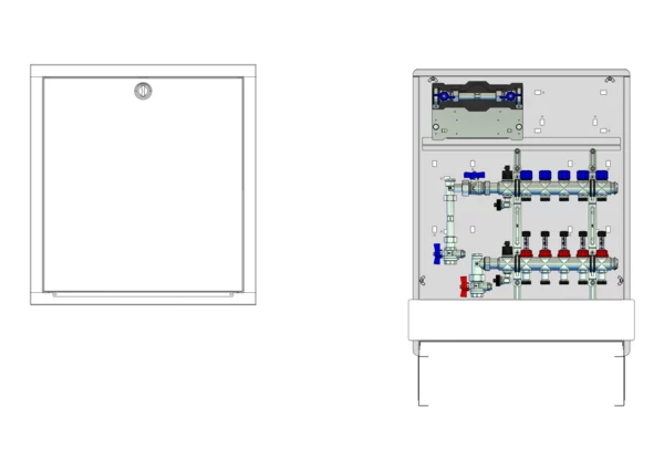 Anschlussstation für Flächenheizung und -kühlung, im Unterputzschrank montierter Edelstahlverteiler mit regulierbaren Durchflussanzeigern und Ventileinsätzen (M30x1,5), vertikale Anschlussgarnitur mit Wärmezählerverrohrung, Wasserzählereinbaustrecke für Trinkwasser kalt, Platzhaltung für Klemmleiste und Stellantriebe.