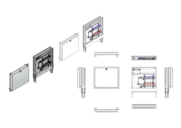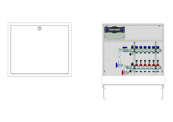 strawa Comfort Anschlussstation FBH-63-V-W1-WMZ-C69 6 Hkr.,BxHxT: 750x775x122 mm, vert. AG. m. WMZ, Verteiler m. DFA 0-3 l/min + THV M30x1,5, Wasserzählerstr. TW kalt, CUP-Schrank m. Frontbl. in RAL 9016