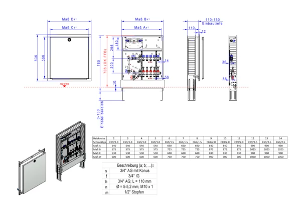 Anschlussstation für Flächenheizung und -kühlung, im Unterputzschrank montierter Edelstahlverteiler mit regulierbaren Durchflussanzeigern und Ventileinsätzen (M30x1,5), vertikale Anschlussgarnitur mit Wärmezählerverrohrung, Wasserzählereinbaustrecke für Trinkwasser kalt, Platzhaltung für Klemmleiste und Stellantriebe.