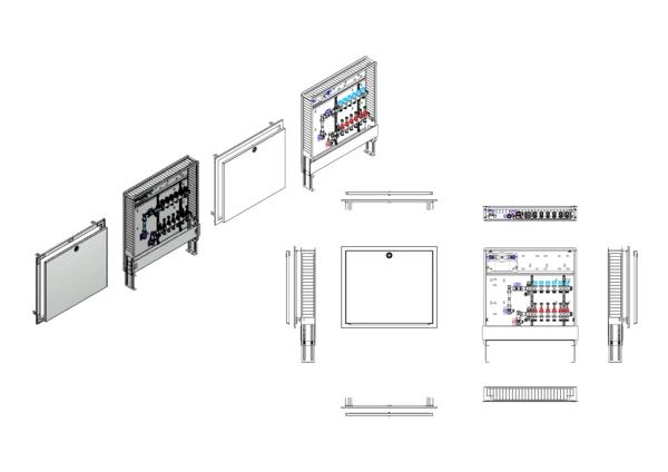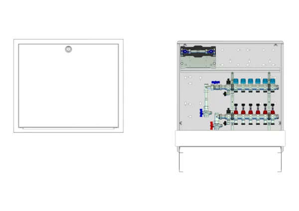 Anschlussstation für Flächenheizung und -kühlung, im Unterputzschrank montierter Edelstahlverteiler mit absperrbarem Durchflussanzeigern und Ventileinsätzen für EGO-Schnellverschluss, vertikale Anschlussgarnitur mit Wärmezählerverrohrung, Wasserzählereinbaustrecke für Trinkwasser kalt, Platzhaltung für Klemmleiste und EGO-Regelantriebe.