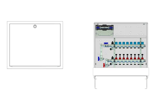 strawa Comfort Anschlussstation FBH-18-V-W1-WMZ-C69 8 Hkr.,BxHxT: 750x775x122 mm, vert. AG. m. WMZ, Verteiler mit DFA min/max + THV, Wasserzählerstr. TW kalt, Comfort-UP-Schrank mit Frontblende in RAL 9016