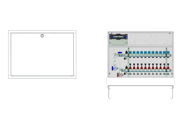 strawa Comfort Anschlussstation FBH-18-V-W1-WMZ-C69 11 Hkr.,BxHxT: 900 x 775 x 122 mm, vert. AG. m. WMZ, Verteiler mit DFA min/max + THV, Wasserzählerstr. TW kalt, Comfort-UP-Schrank mit Frontblende in RAL 9016