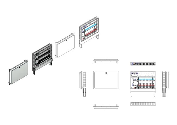 Anschlussstation für Flächenheizung und -kühlung, im Unterputzschrank montierter Edelstahlverteiler mit absperrbarem Durchflussanzeigern und Ventileinsätzen für EGO-Schnellverschluss, vertikale Anschlussgarnitur mit Wärmezählerverrohrung, Wasserzählereinbaustrecke für Trinkwasser kalt, Platzhaltung für Klemmleiste und EGO-Regelantriebe.