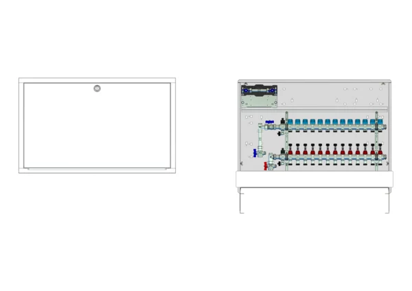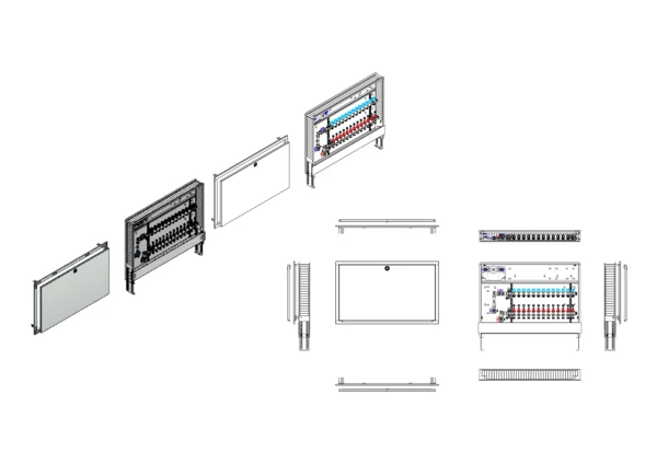 Anschlussstation für Flächenheizung und -kühlung, im Unterputzschrank montierter Edelstahlverteiler mit absperrbarem Durchflussanzeigern und Ventileinsätzen für EGO-Schnellverschluss, vertikale Anschlussgarnitur mit Wärmezählerverrohrung, Wasserzählereinbaustrecke für Trinkwasser kalt, Platzhaltung für Klemmleiste und EGO-Regelantriebe.