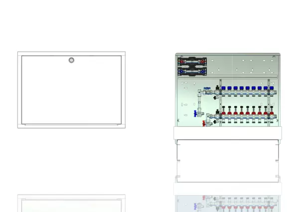 Anschlussstation für Flächenheizung und -kühlung, im Unterputzschrank montierter Edelstahlverteiler mit regulierbaren Durchflussanzeigern und Ventileinsätzen (M30x1,5), vertikale Anschlussgarnitur mit Wärmezählerverrohrung, Wasserzählereinbaustrecke für Trinkwasser kalt und warm, Platzhaltung für Klemmleiste und Stellantriebe