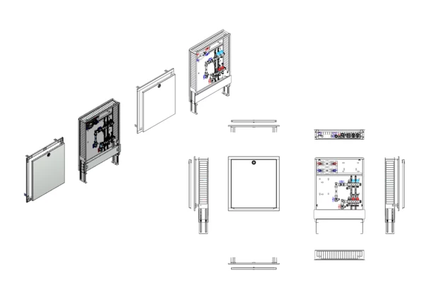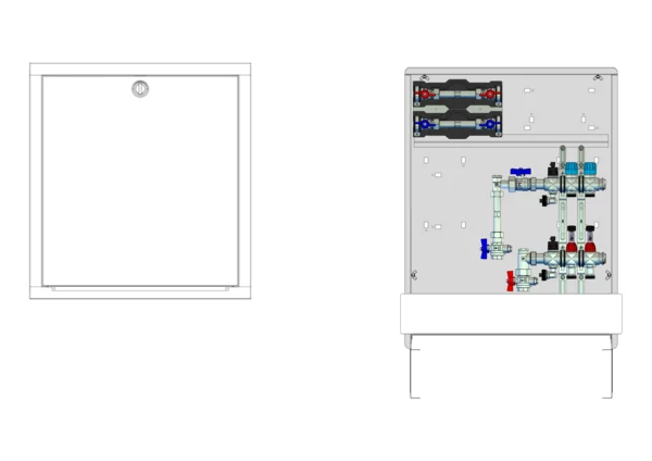 strawa Comfort Anschlussstation FBH-18-V-W2-WMZ-C69 2 Hkr.,BxHxT: 600x775x122 mm, vert. AG. m. WMZ, Verteiler mit DFA min/max + THV, Wasserzählerstr. TW kalt u. warm, Comfort-UP-Schrank mit Frontblende in RAL 9016