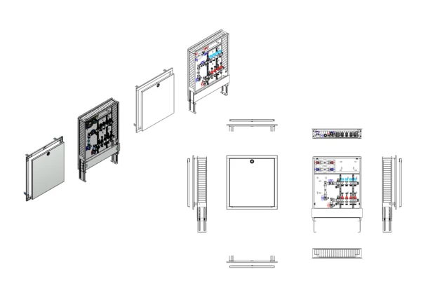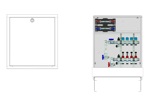 strawa Comfort Anschlussstation FBH-18-V-W2-WMZ-C69 4 Hkr.,BxHxT: 600x775x122 mm, vert. AG. m. WMZ, Verteiler mit DFA min/max + THV, Wasserzählerstr. TW kalt u. warm, Comfort-UP-Schrank mit Frontblende in RAL 9016