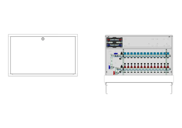strawa Comfort Anschlussstation FBH-18-V-W2-WMZ-C69 14 Hkr.,BxHxT: 1050x775x122 mm, vert. AG. m. WMZ, Verteiler mit DFA min/max + THV, Wasserzählerstr. TW kalt u. warm, Comfort-UP-Schrank mit Frontblende in RAL 9016