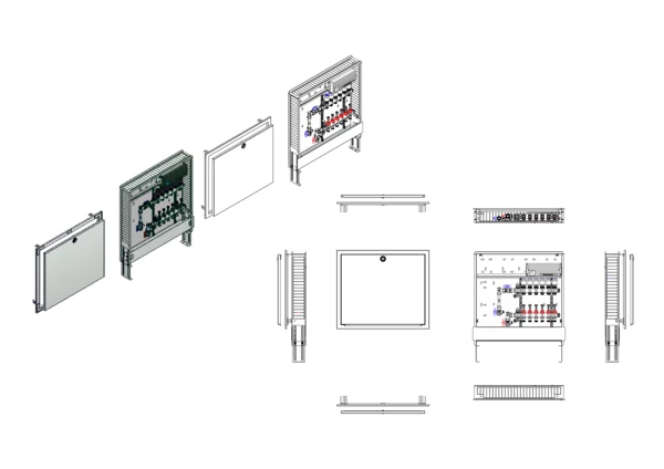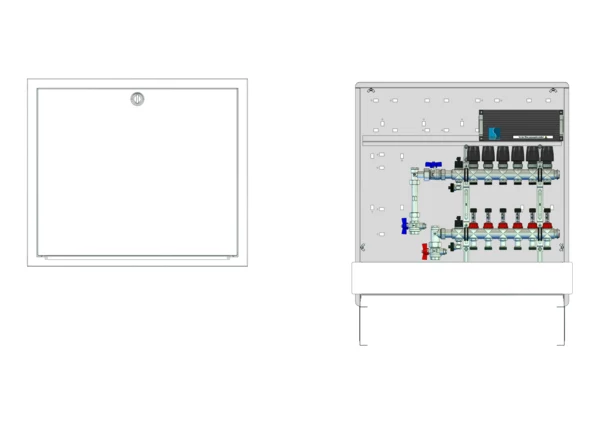 Anschlussstation für Flächenheizung, im Unterputzschrank montierter Edelstahlverteiler mit regulierbaren Durchflussanzeigern und Ventileinsätzen (M30x1,5), vertikale Anschlussgarnitur mit Wärmezählerverrohrung, vormontierte und verdrahtete Stellantriebe auf montierter Klemmleiste, Platzhaltung für Wasserzählereinbaustrecke.