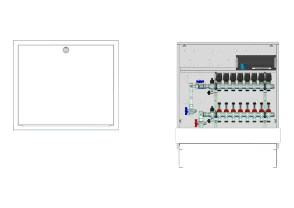 Anschlussstation für Flächenheizung, im Unterputzschrank montierter Edelstahlverteiler mit regulierbaren Durchflussanzeigern und Ventileinsätzen (M30x1,5), vertikale Anschlussgarnitur mit Wärmezählerverrohrung, vormontierte und verdrahtete Stellantriebe auf montierter Klemmleiste, Platzhaltung für Wasserzählereinbaustrecke.