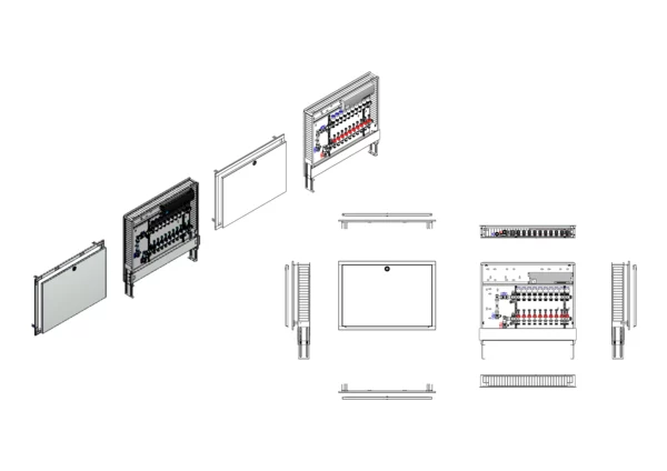 Anschlussstation für Flächenheizung, im Unterputzschrank montierter Edelstahlverteiler mit regulierbaren Durchflussanzeigern und Ventileinsätzen (M30x1,5), vertikale Anschlussgarnitur mit Wärmezählerverrohrung, vormontierte und verdrahtete Stellantriebe auf montierter Klemmleiste, Platzhaltung für Wasserzählereinbaustrecke.
