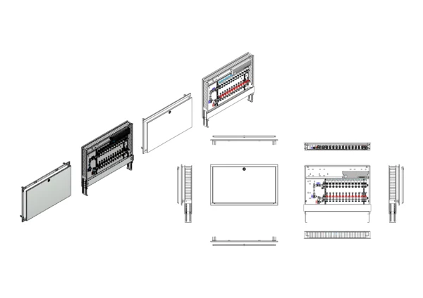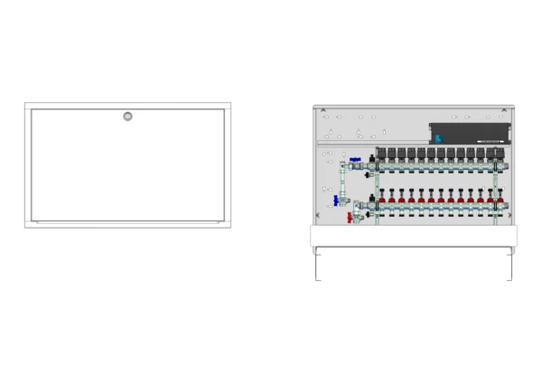 Anschlussstation für Flächenheizung, im Unterputzschrank montierter Edelstahlverteiler mit regulierbaren Durchflussanzeigern und Ventileinsätzen (M30x1,5), vertikale Anschlussgarnitur mit Wärmezählerverrohrung, vormontierte und verdrahtete Stellantriebe auf montierter Klemmleiste, Platzhaltung für Wasserzählereinbaustrecke.
