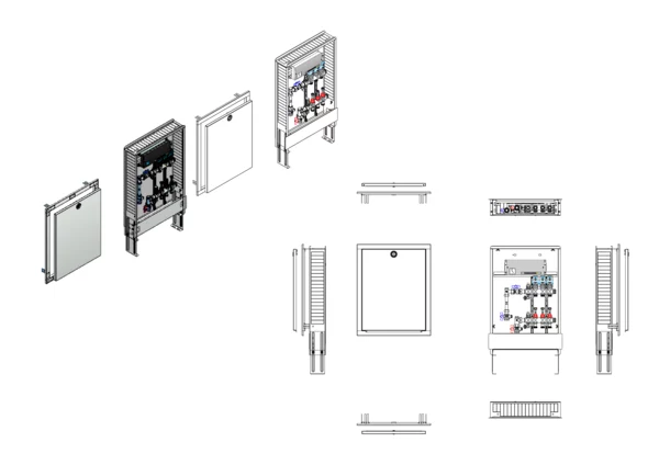 Anschlussstation für Flächenheizung, im Unterputzschrank montierter Edelstahlverteiler mit absperrbarem Durchflussanzeigern und Ventileinsätzen für EGO-Schnellverschluss, vertikale Anschlussgarnitur mit Wärmezählerverrohrung, vormontierte und vorverdrahtete EGO-Regelantriebeantriebe auf vormontierter Klemmleiste, Platzhaltung für Wasserzählereinbaustrecke