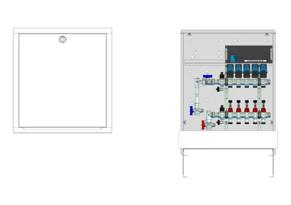 strawa Comfort Anschlussstation FBH-18-V-WMZ-C69-EGO 5 Hkr.,BxHxT: 600 x 775 x 122 mm, vert. AG. m. WMZ, Verteiler mit DFA min/max + THV, mit vorm. EGO-Regelantr. u. Klemml. mit Vorverdr., Comfort-UP-Schrank mit Frontblende in RAL 9016