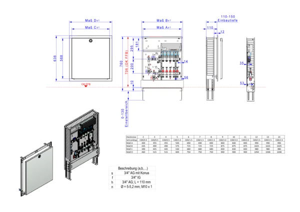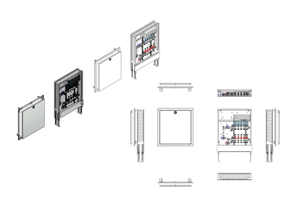 Anschlussstation für Flächenheizung, im Unterputzschrank montierter Edelstahlverteiler mit absperrbarem Durchflussanzeigern und Ventileinsätzen für EGO-Schnellverschluss, vertikale Anschlussgarnitur mit Wärmezählerverrohrung, vormontierte und vorverdrahtete EGO-Regelantriebe auf vormontierter Klemmleiste, Platzhaltung für Wasserzählereinbaustrecke.