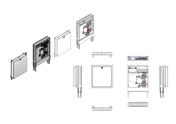 Anschlussstation für Flächenheizung, im Unterputzschrank montierter Edelstahlverteiler mit absperrbarem Durchflussanzeigern und Ventileinsätzen für EGO-Schnellverschluss, vertikale Anschlussgarnitur mit Wärmezählerverrohrung, Wasserzählereinbaustrecke für Trinkwasser kalt, vormontierte und vorverdrahtete EGO-Regelantriebe auf vormontierter Klemmleiste.