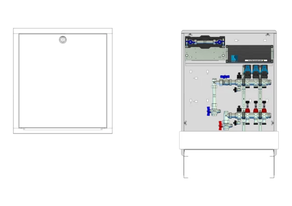 strawa Comfort Anschlussstation FBH-18-V-W1-WMZ-C69-EGO 3 Hkr.,BxHxT: 600 x 775 x 122 mm, vert. AG. m. WMZ, Verteiler mit DFA min/max + THV, mit vorm. EGO-Regelantr. u. Klemml. mit Vorverdr., Wasserzählerstr. TW kalt, CUP-Schrank m. Frontblende RAL 9016