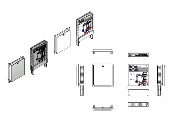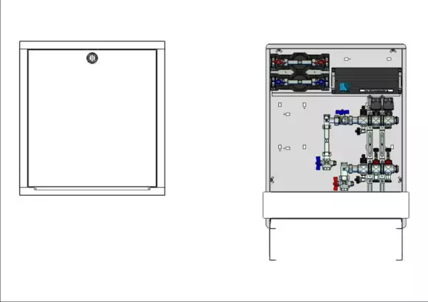 vertikale Anschlussgarnitur mit Wärmezählerverohrung, Verteiler mit Durchflussanzeiger 0-3 l/min im Vorlaufbalken und Thermostatventileinsatz M30x1,5 im Rücklaufbalken, vormontierte Stellantriebe und Klemmleiste mit Vorverdrahtung, Wasserzählerstrecken Trinkwasser kalt und warm, Comfort-Unterputz-Schrank mit Frontblende RAL 9016