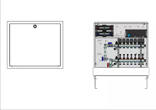 vertikale Anschlussgarnitur mit Wärmezählerverohrung, Verteiler mit Durchflussanzeiger 0-3 l/min im Vorlaufbalken und Thermostatventileinsatz M30x1,5 im Rücklaufbalken, vormontierte Stellantriebe und Klemmleiste mit Vorverdrahtung, Wasserzählerstrecken Trinkwasser kalt und warm, Comfort-Unterputz-Schrank mit Frontblende RAL 9016