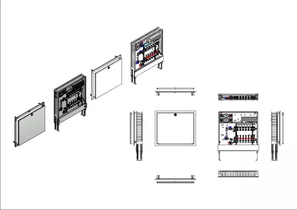 Anschlussstation für Flächenheizung, im Unterputzschrank montierter Edelstahlverteiler mit regulierbaren Durchflussanzeigern und Ventileinsätzen (M30x1,5), vertikale Anschlussgarnitur mit Wärmezählerverrohrung, Wasserzählereinbaustrecke für Trinkwasser kalt und warm, vormontierte und verdrahtete Stellantriebe auf montierter Klemmleiste.