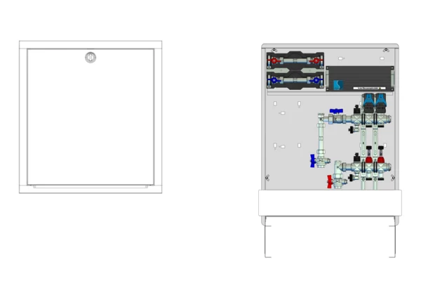 strawa Comfort Anschlussstation FBH-18-V-W2-WMZ-C69-EGO 2 Hkr.,BxHxT: 600 x 775 x 122 mm, vert. AG. m. WMZ, Verteiler mit DFA min/max+THV, m. vorm. EGO-Regelantr. u. Klemml. mit Vorverdr., Wasserzählerstr. TW kalt u. warm, CUP-Schrank m. Frontbl. RAL 9016