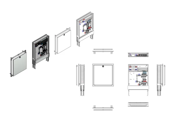 Anschlussstation für Flächenheizung, im Unterputzschrank montierter Edelstahlverteiler mit absperrbarem Durchflussanzeigern und Ventileinsätzen für EGO-Schnellverschluss, vertikale Anschlussgarnitur mit Wärmezählerverrohrung, Wasserzählereinbaustrecke für Trinkwasser kalt und warm, vormontierte und vorverdrahtete EGO-Regelantriebe auf vormontierter Klemmleiste.