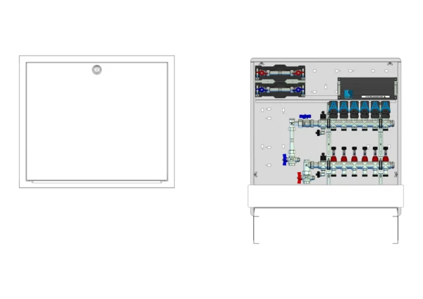 strawa Comfort Anschlussstation FBH-18-V-W2-WMZ-C69-EGO 6 Hkr.,BxHxT: 750x775x122 mm, vert. AG m. WMZ, Verteiler mit DFA min/max+THV, m. vorm. EGO-Regelantr. u. Klemml. mit Vorverdr., Wasserzählerstr. TW kalt u. warm, CUP-Schrank m. Frontbl. RAL 9016