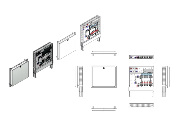 Anschlussstation für Flächenheizung, im Unterputzschrank montierter Edelstahlverteiler mit absperrbarem Durchflussanzeigern und Ventileinsätzen für EGO-Schnellverschluss, vertikale Anschlussgarnitur mit Wärmezählerverrohrung, Wasserzählereinbaustrecke für Trinkwasser kalt und warm, vormontierte und vorverdrahtete EGO-Regelantriebe auf vormontierter Klemmleiste.