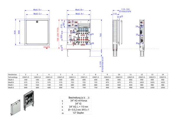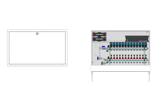 strawa Comfort Anschlussstation FBH-18-V-W2-WMZ-C69-EGO 13 Hkr.,BxHxT: 1050 x 775 x 122 mm, vert. AG. m. WMZ, Verteiler mit DFA min/max+THV, m. vorm. EGO-Regelantr. u. Klemml. mit Vorverdr., Wasserzählerstr. TW kalt u. warm, CUP-Schrank m. Frontbl. RAL 9016
