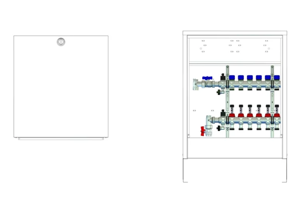 Anschlussstation für Flächenheizung und -kühlung, im Aufputzschrank montierter Edelstahlverteiler mit regulierbaren Durchflussanzeigern und Ventileinsätzen (M30x1,5), vertikale Anschlussgarnitur ohne Wärmezählerverrohrung. Platzhaltung für Klemmleiste und Stellantriebe.