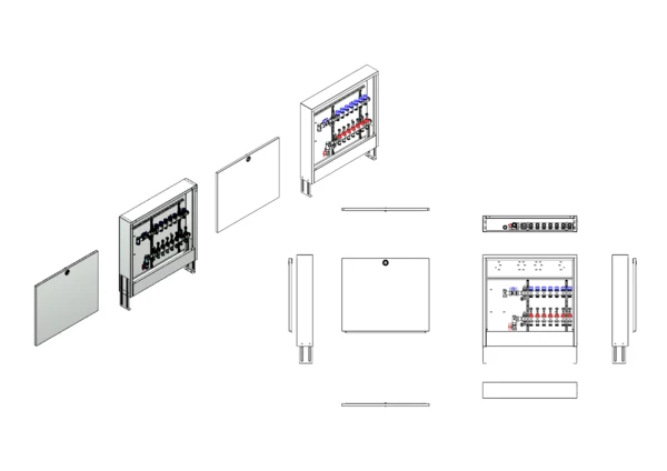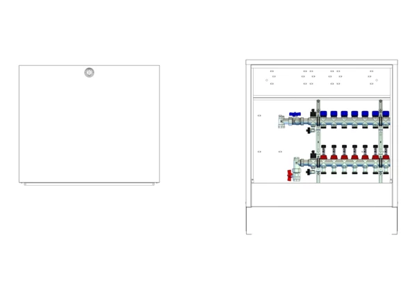 Anschlussstation für Flächenheizung und -kühlung, im Aufputzschrank montierter Edelstahlverteiler mit regulierbaren Durchflussanzeigern und Ventileinsätzen (M30x1,5), vertikale Anschlussgarnitur ohne Wärmezählerverrohrung. Platzhaltung für Klemmleiste und Stellantriebe.