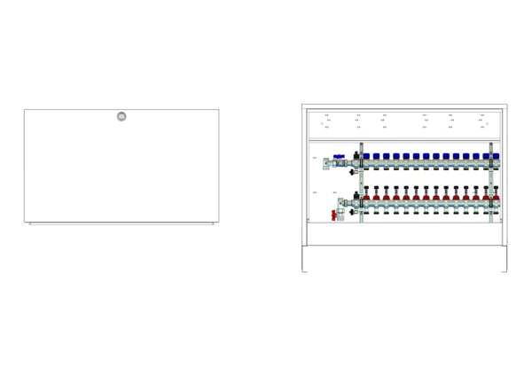 Anschlussstation für Flächenheizung und -kühlung, im Aufputzschrank montierter Edelstahlverteiler mit regulierbaren Durchflussanzeigern und Ventileinsätzen (M30x1,5), vertikale Anschlussgarnitur ohne Wärmezählerverrohrung. Platzhaltung für Klemmleiste und Stellantriebe.