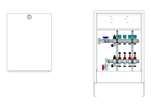 Anschlussstation für Flächenheizungen im Aufputzschrank: Diese Station enthält einen Edelstahlverteiler mit absperrbaren Durchflussanzeigern und Ventileinsätzen für EGO-Schnellverschluss. Die vertikale Anschlussgarnitur kommt ohne Wärmezählerverrohrung, bietet jedoch Platz für eine Klemmleiste und EGO-Regelantriebe.