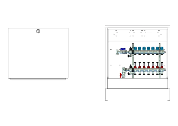 strawa Comfort Anschlussstation FBH-18-V-CA 7 Hkr.,BxHxT: 732x710x125 mm, vert. AG. o. WMZ, Verteiler mit DFA min/max + THV für EGO, Comfort-AP-Schrank in RAL 9016