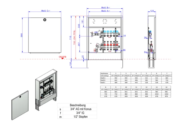 strawa Comfort Anschlussstation FBH-18-V-CA 12 Hkr.,BxHxT: 882 x 710 x 125 mm, vert. AG. o. WMZ, Verteiler mit DFA min/max + THV für EGO, Comfort-AP-Schrank in RAL 9016