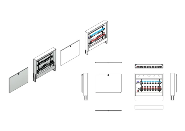 Anschlussstation für Flächenheizungen im Aufputzschrank: Diese Station enthält einen Edelstahlverteiler mit absperrbaren Durchflussanzeigern und Ventileinsätzen für EGO-Schnellverschluss. Die vertikale Anschlussgarnitur kommt ohne Wärmezählerverrohrung, bietet jedoch Platz für eine Klemmleiste und EGO-Regelantriebe.